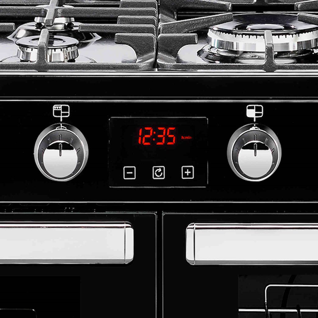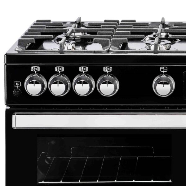 100cm gas range cooker with 7 burner gas hob with 4kW PowerWok burner, Maxi-Clock and easy clean enamel.